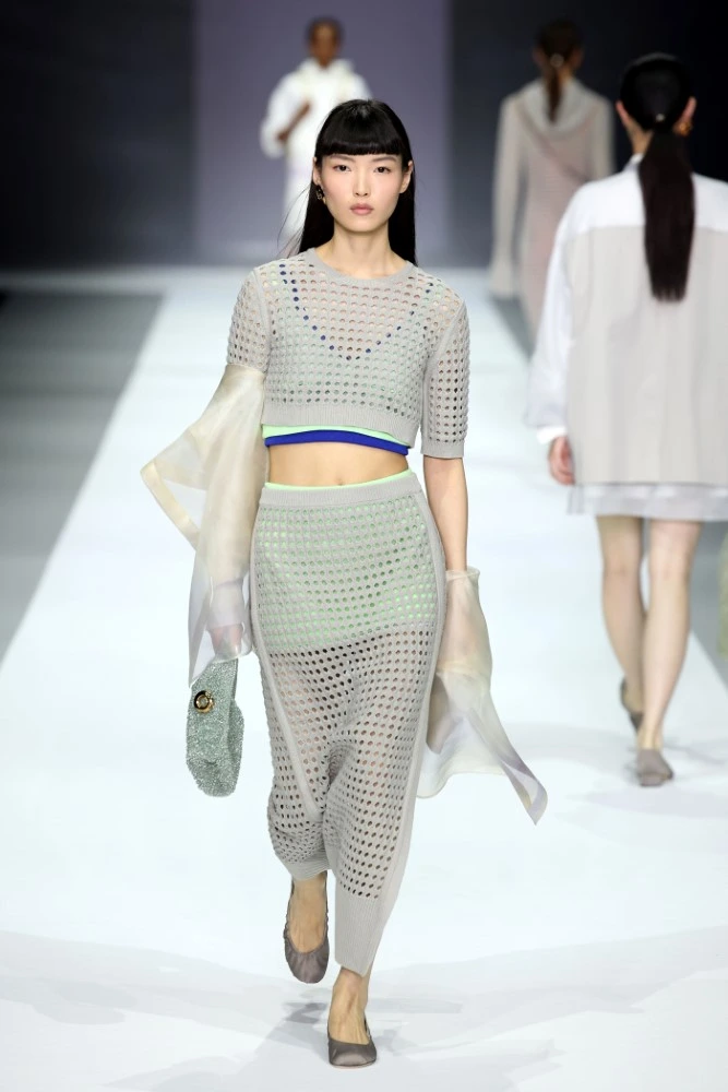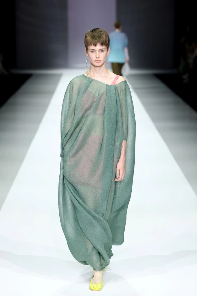 Translucent and soft fabrics exude a subtle sensuality. Sheer chiffon, silk gauze, and nylon blends appear with all-over patterns featuring barely perceptible textures. The shapes are soft, and the materials are puffed and woven into imaginative forms.