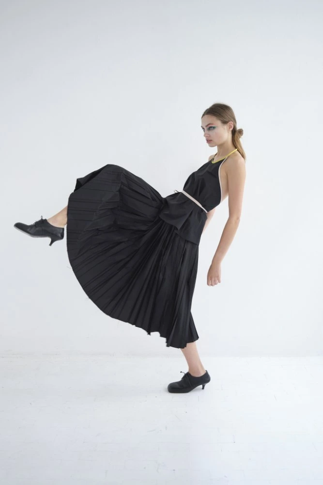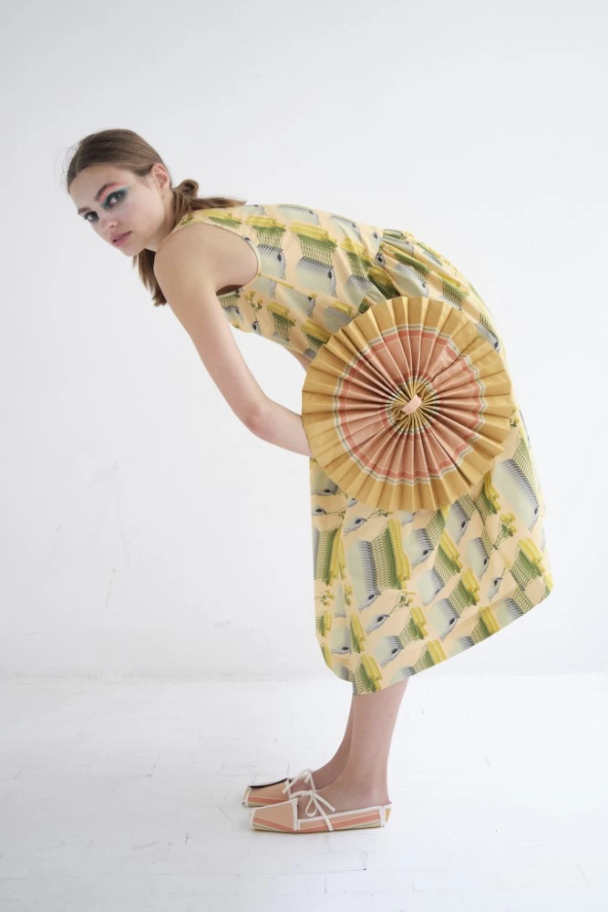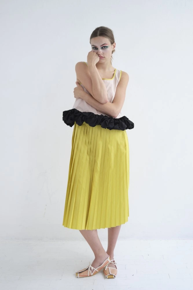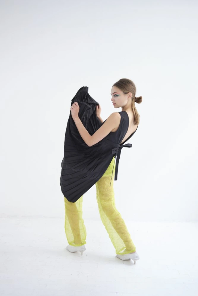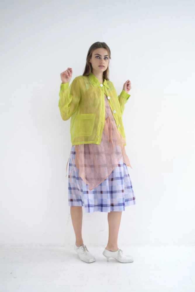 A classic vichy and abstract herringbone graphic symbolizes a domestic, consciously classic feeling – maybe reminiscent of a kitchen towel or the wooden inlay parquet at your grandmother’s? but through the transparency of tulle and crinkly cotton muslin or tiny over layered plisse these seemingly conservative graphics gain a special edge.