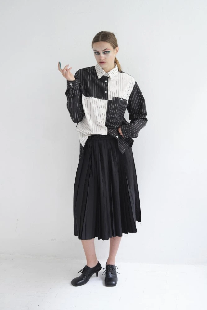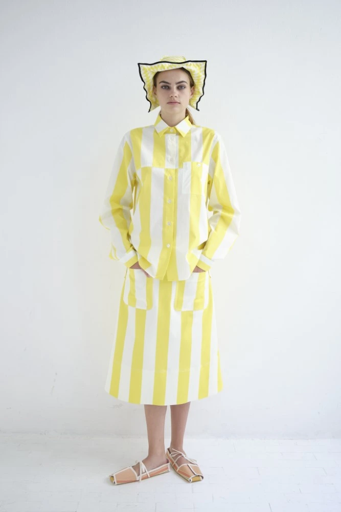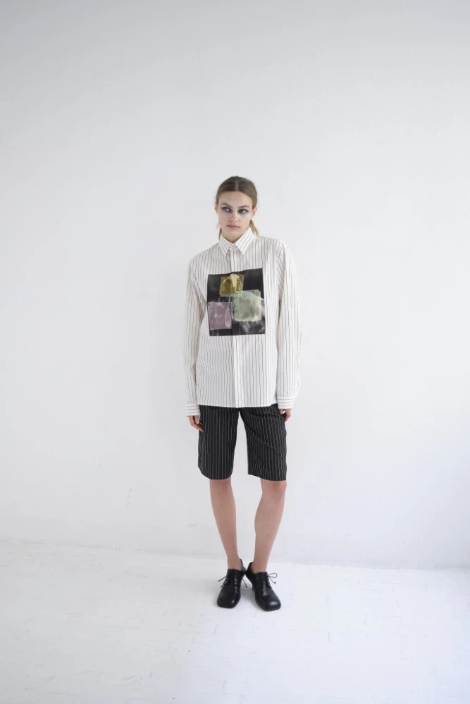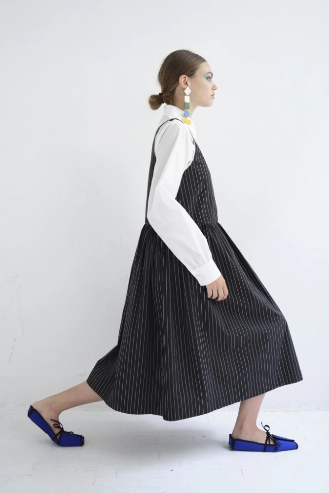 Black and white pinstriped Japanese cotton stands for the quiet, linear moment between all the gestures and colors.