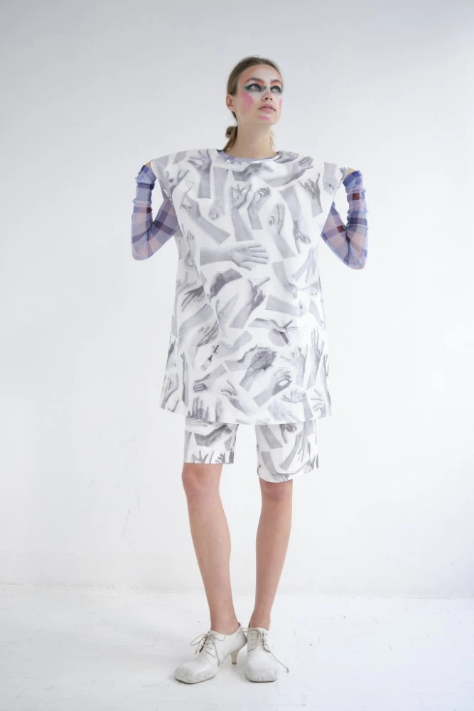 Like often the inspiration comes from the people around you. This time the long, expressive hands of our intern Francesco turned into the starting point. We photographed them and subsequently turned them into a print. Hands are the central element throughout our Spring25 collection. There is so much hands can say: through creation and expression, physical contact, small gestures or acts of kindness like giving a flower .