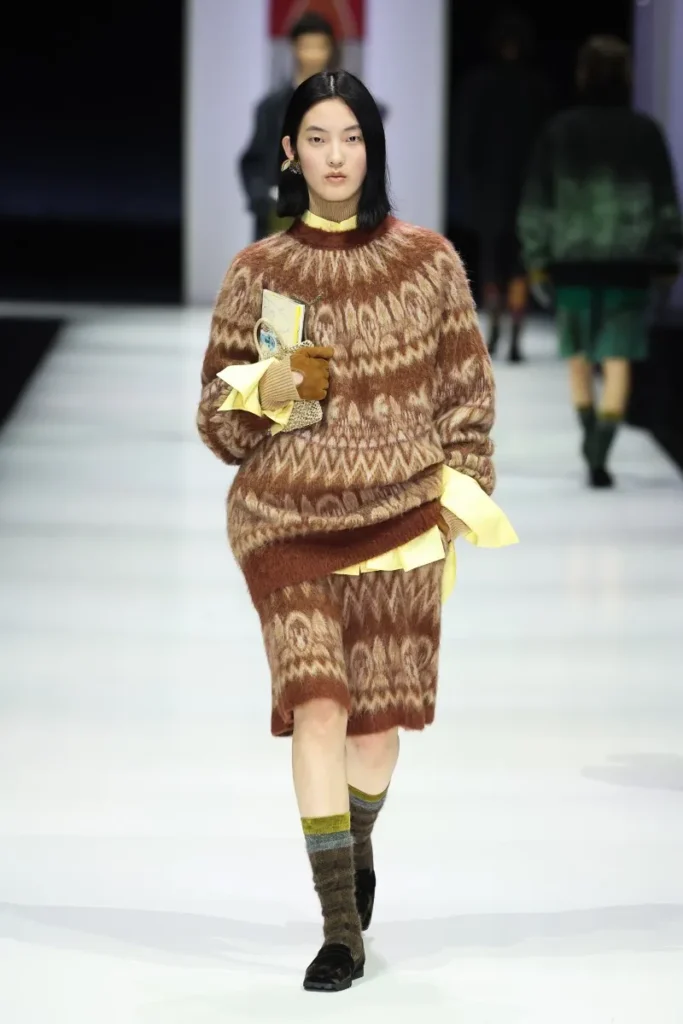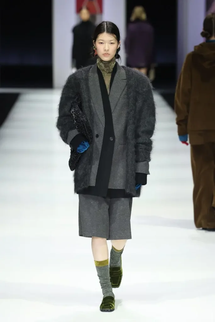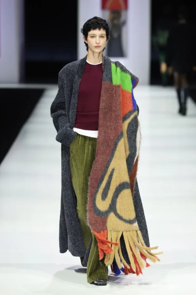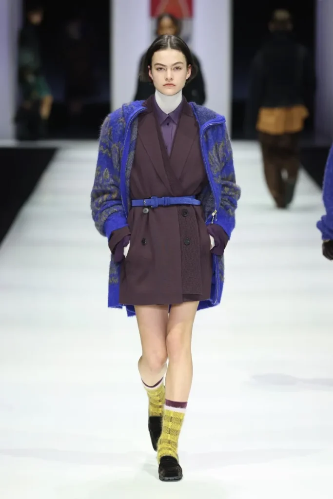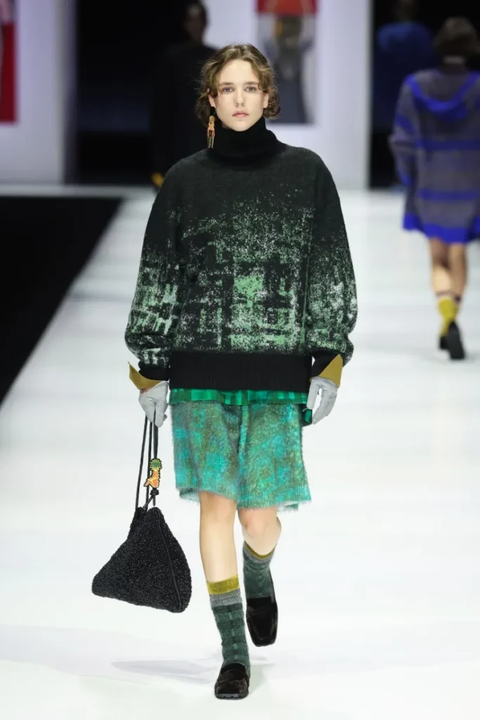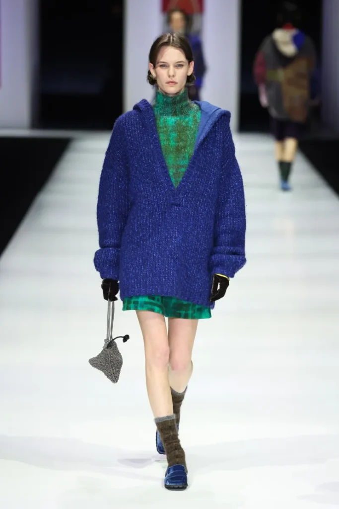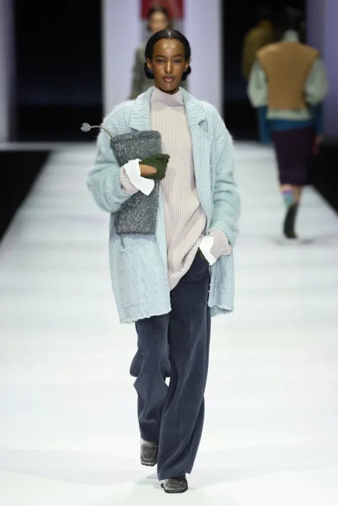 Texture takes center stage this season: cashmere, velvet, mohair, and winter mesh merge to offer a unique sensory experience. Innovative materials like fleece, nylon, and bouclé contribute to an aesthetic that invites living every garment as a work of art, meant to be touched and experienced.