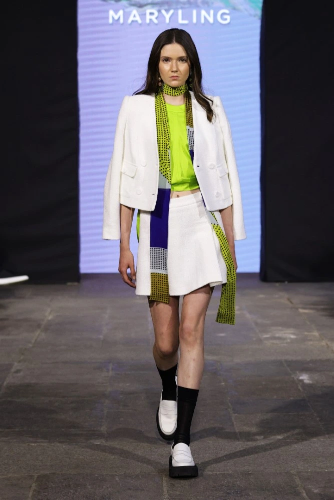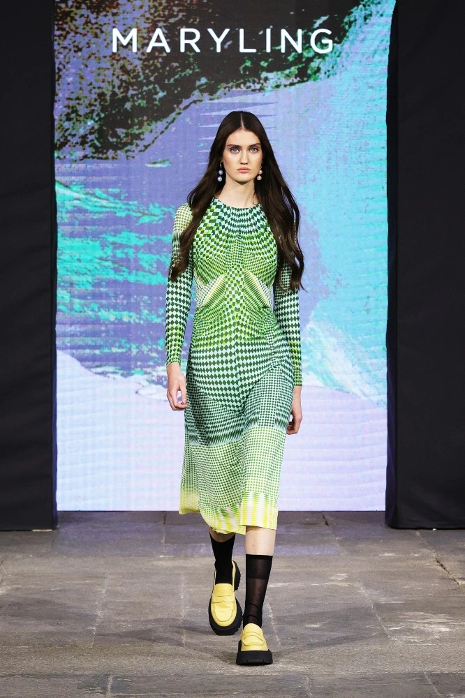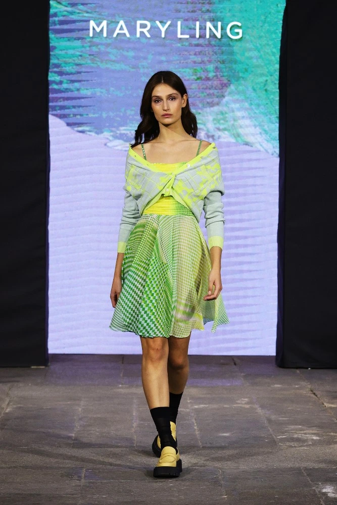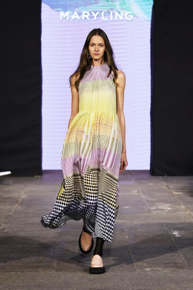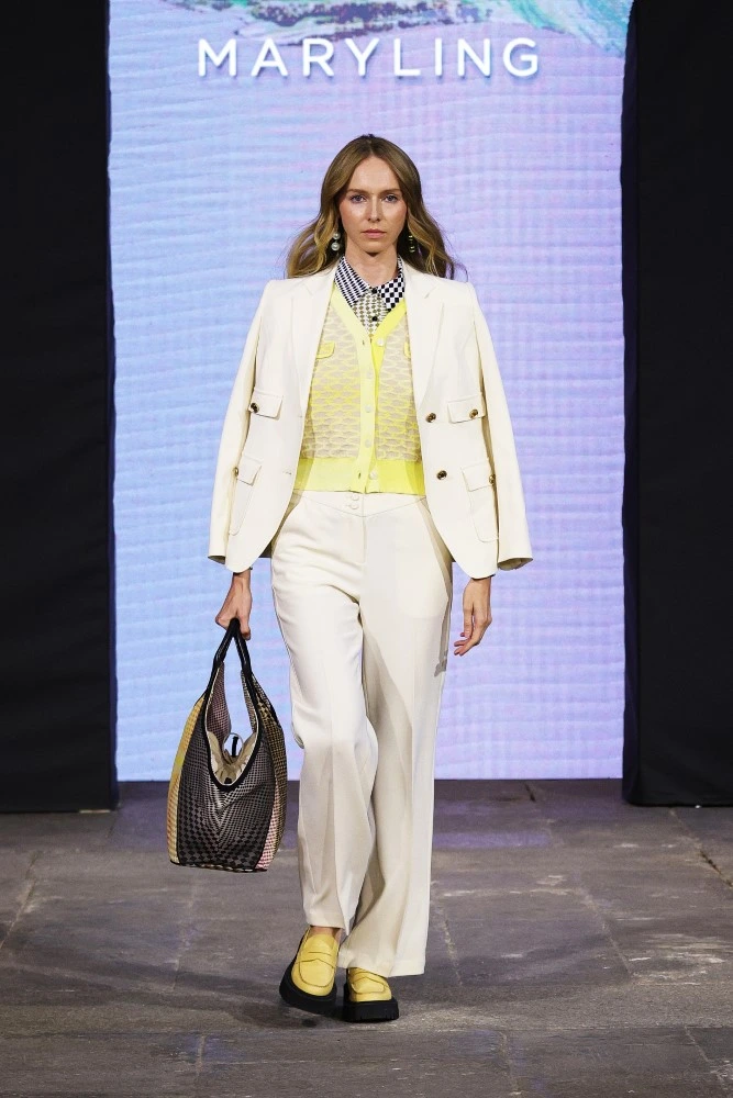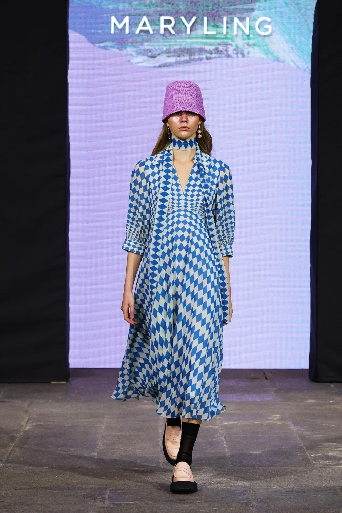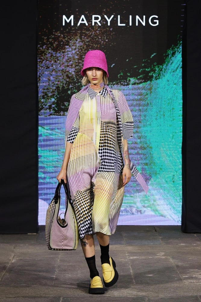 The MARYLING SS25 collection celebrates the avid gaze of modern life, focusing on seeking and discovering everything, everywhere, and being enveloped by it. Anything goes. Pixels and squares, lines and geometric shapes even in their simplest form are grouped together to form patterns. From the graphic motifs of Parisian pedestrian crossings to the painted, vintage doors of London; from the archaeological treasures of the Fondazione del Duomo di Milano to the extraordinary mosaic floor of Palazzo Ambrosiano: everything is a source of inspiration and simultaneously a background for the garments in the new collection.