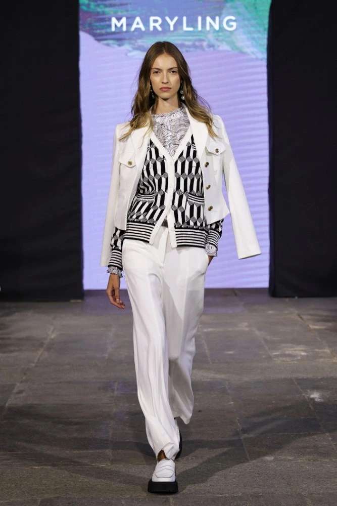 Here, then, are knit motifs with tonal intarsia or black on white, perfect for reflecting the geometric shapes of architecture and Op-Art, while the typical colors of MARYLING like electric blue, dark pink and peach are always present. And it is the clothes that create optical effects capable of transforming illusion into reality with the complicity of layering that moves, deceiving the eyes. Silk chiffon is layered and printed, while single-color habotai is chosen to dress without restraint.