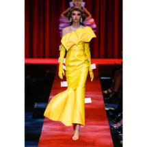 For this DSquared2 Spring-Summer collection, the Caten twins reread the glamour of the fabulous 80s and reinterpret it with the iconoclastic spirit that has always distinguished them: classic jeans are studded with crystals and worn with puffed sleeve t-shirts, animalized sheath dresses are adorned with jais details, the worn‑out denim shirt is paired with micro skirts rich in maxi bows, and the tail coat becomes a seductive mini-dress.