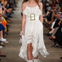 Alessandro Dell’Acqua’s latest No. 21 collection had something for everyone one. It was both feminine and empowering, with a sporty edge. This season, Dell’Acqua opened the show with fresh white dresses; one standout piece was a 30s-style slip dress with a sequin poncho. Following with asymmetric skirts, created by layered mesh over macramé lace. Parkas and anoraks reworked in patchworks of lace, satin and tulle in an inky palette of black and blues. The looks were finished with a tougher styling detail of strappy pumps with added bows.