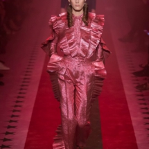 More is more continues as the Gucci mantra. Where most designers choose a singular historical reference, Alessandro Michele picks moments in time from an eclectic dressing-up box of eras. Or as he described it: “Non-linear and unpredictable connections.” Dresses were layered under knitwear, flares teamed with check jackets, delicate chiffon dresses scattered with sparkle, mash-ups of print, sequins, print T-shirts and floral ruched taffeta cocktail dresses. To top all this off, each look had at least a bowed turban, crystal encrusted glasses or gigantic chandelier‑like earrings.