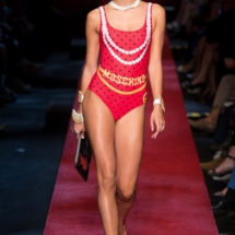 Jeremy Scott certainly dances to the beat of his own drum, but you can’t help liking the rhythm. For spring/summer, Scott for Moschino took the idea of the paper dressing-up doll with her interchangeable wardrobe, complete with attachable tabs. 3D prints gave the illusion of draping, swimsuits imitated bikinis, and printed cut-off shorts came with fishnet tights. Maybe 2D printed outfits that create the illusion of 3D are a flattering way forward…