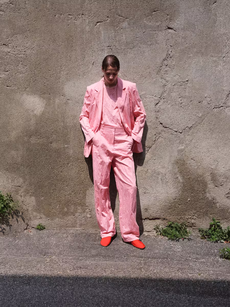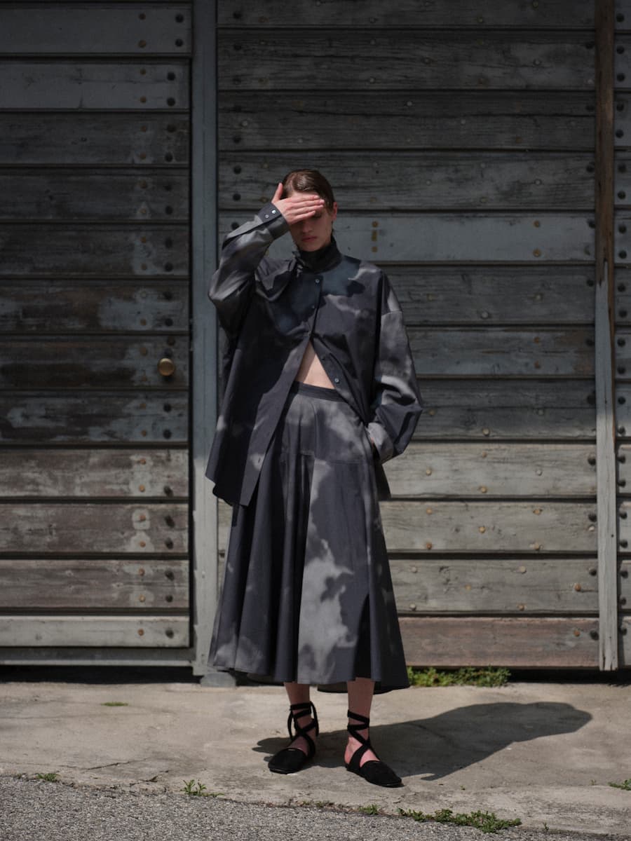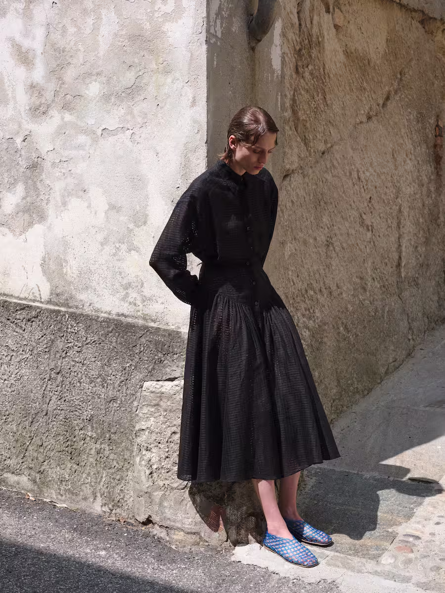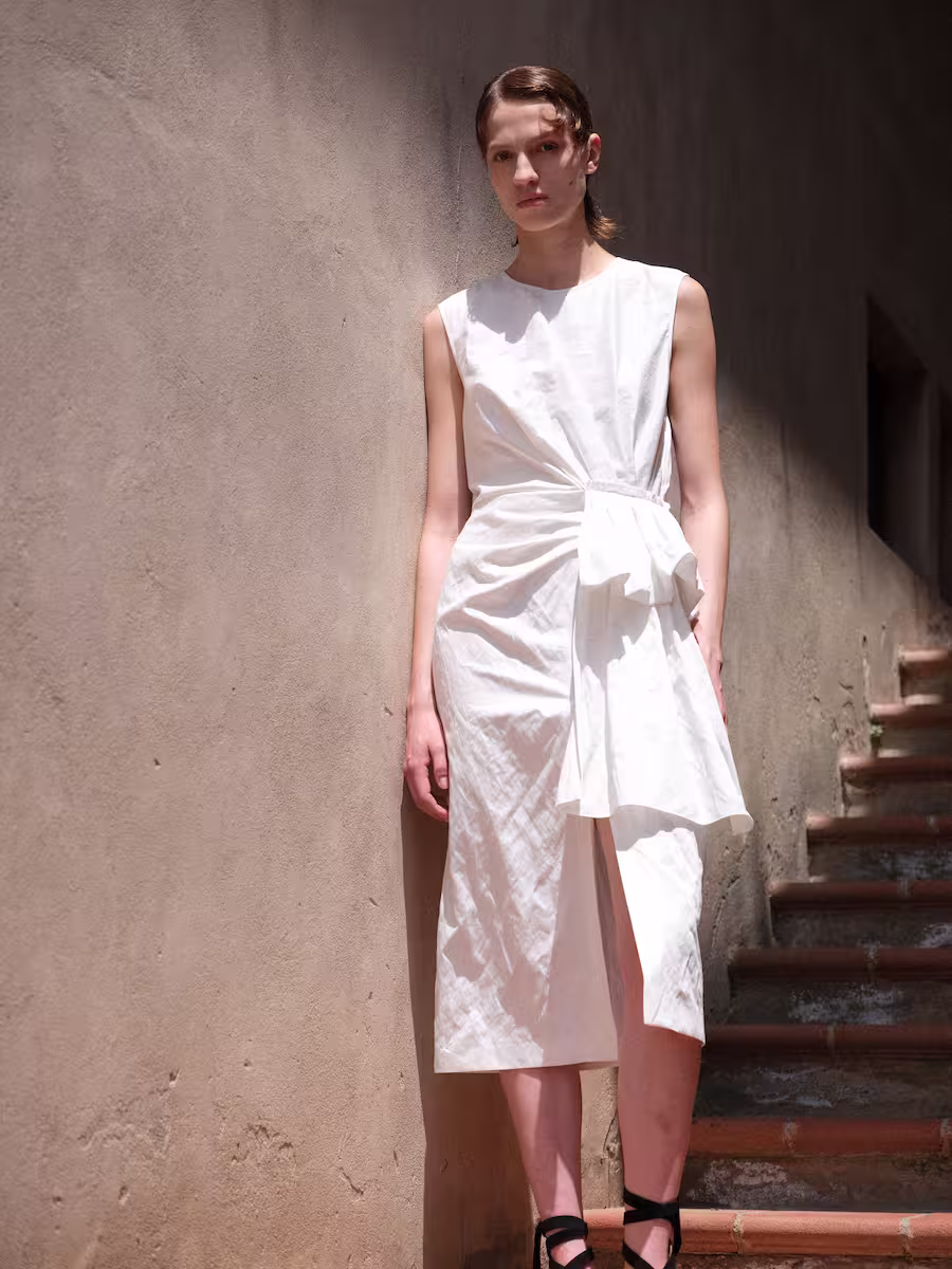 Long trapeze dresses in black and white, crafted from linen or cotton in smoky gray and pink Nuvola prints, feature natural crinkled effects. The same technique is applied to soft pastel suits in crushed cotton, woven with a touch of metallic thread for a subtle sheen. Ramie—an organic, sustainable fabric known as the “silk of linen”—adds refinement and luminosity to dresses in cream and chocolate brown.