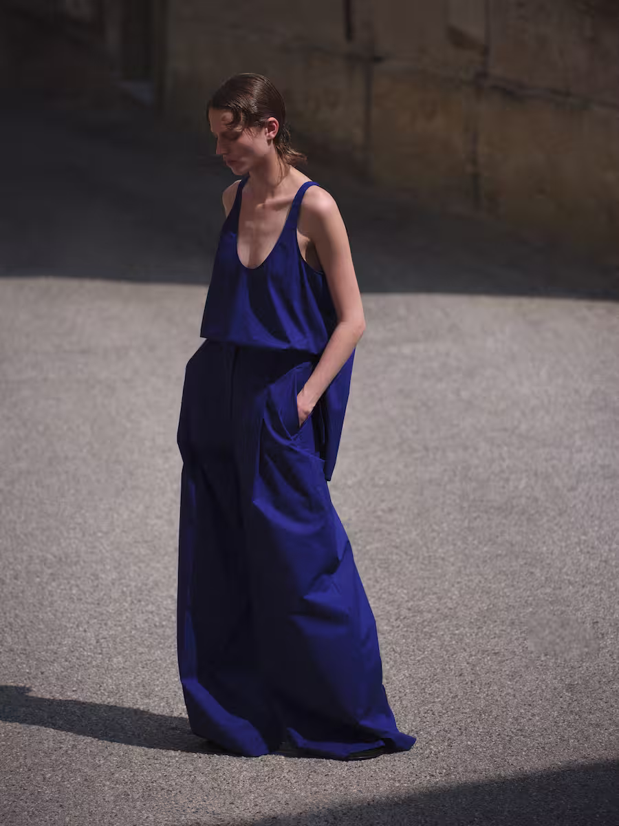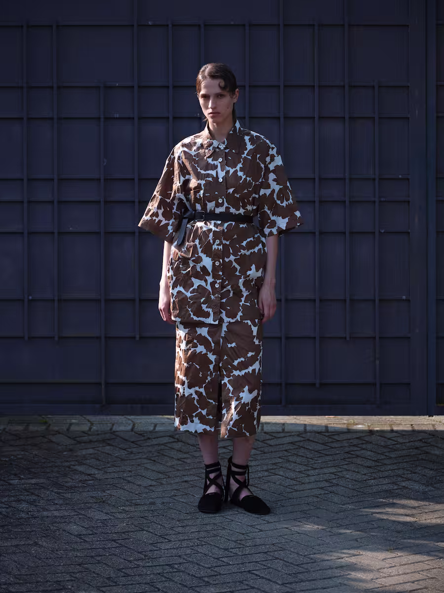 The silhouettes are relaxed and fluid: flared skirts and long caftan dresses with elbow length sleeves and Victorian-inspired puffed shoulders are brought to life by the three-dimensional Nuvola print. Daisies, the collection’s signature flower, shine in refined embroideries: hand-sewn sequins on straight-cut dresses add texture and light. The floral motif also takes an abstract turn, with petals reimagined in blue and brown prints featuring organic textures created by hand-applied pigment.