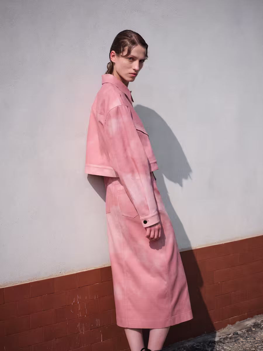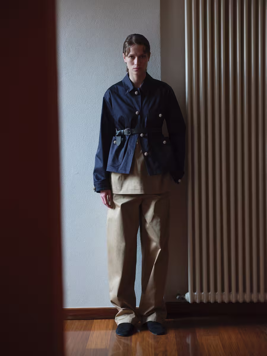 This season also redefines the worker’s jacket with sharp new geometries. Worn with skirts, trousers, or maxi-shorts, it becomes a versatile piece: in white with a blue collar or in a bomber version with bold topstitching, it recalls sportswear; with jeweled buttons, it transforms into an evening-ready statement.