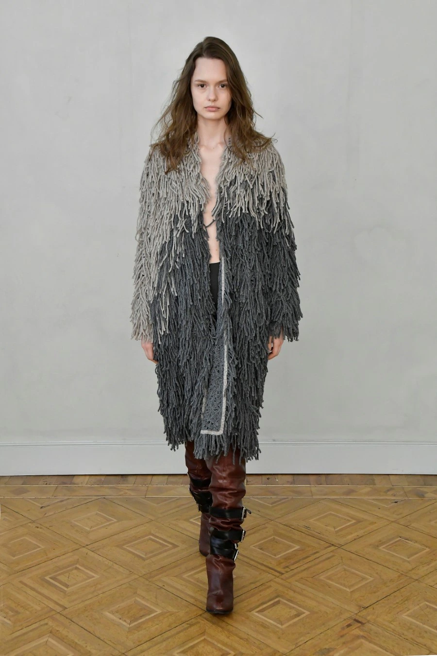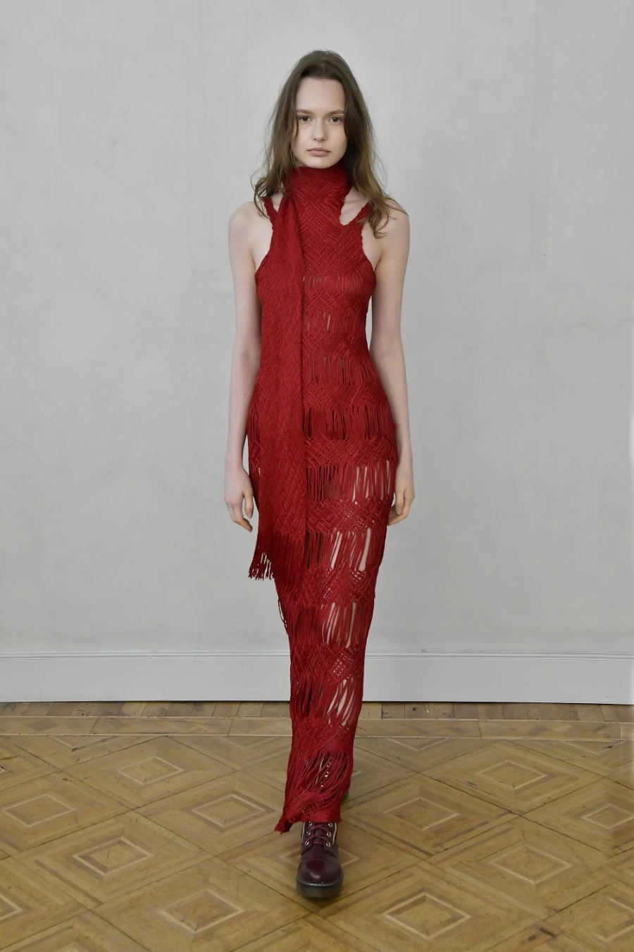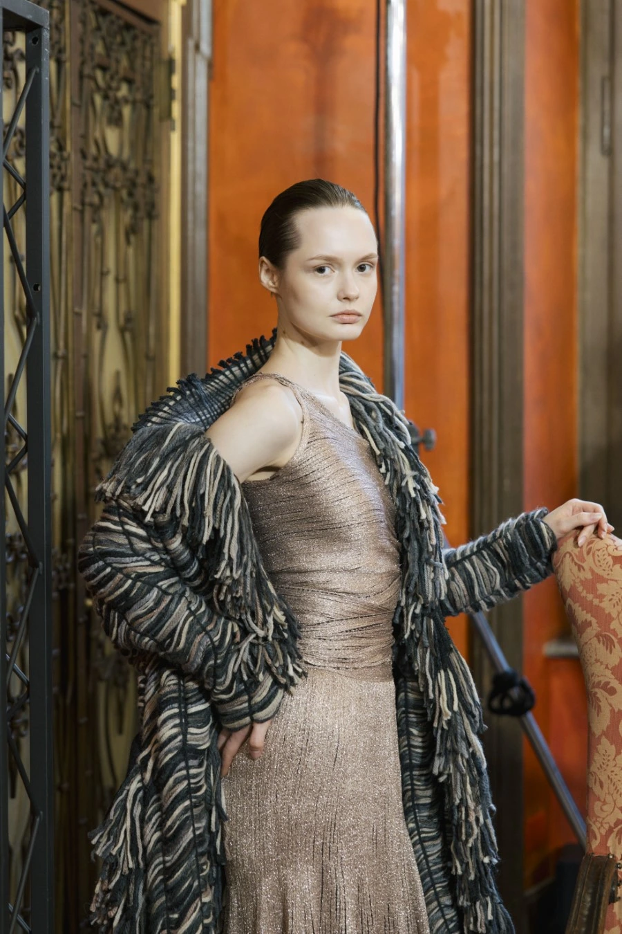 The fabrics reinforce this sense of duration. Dense, voluminous, structured wools; textures that absorb light and create depth. The palette moves through neutral and mineral tones, where red is not merely colour, but presence.