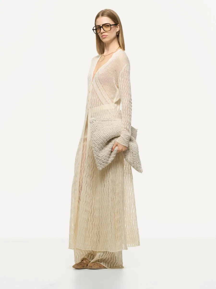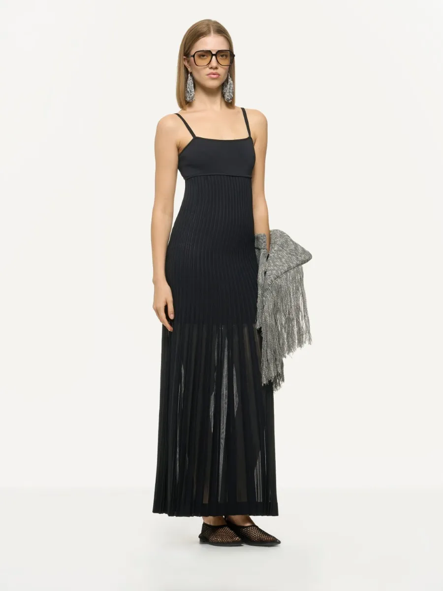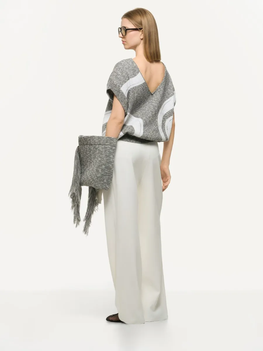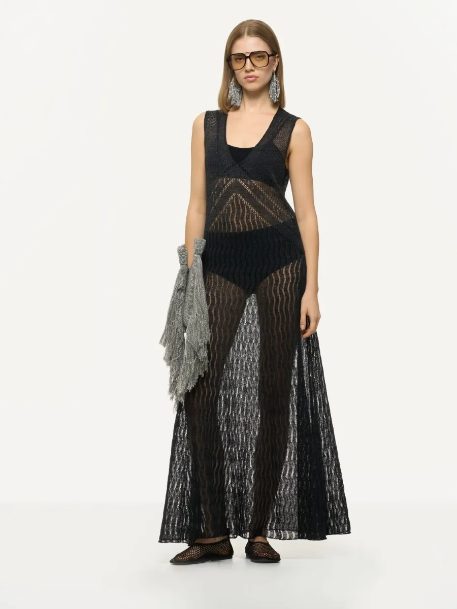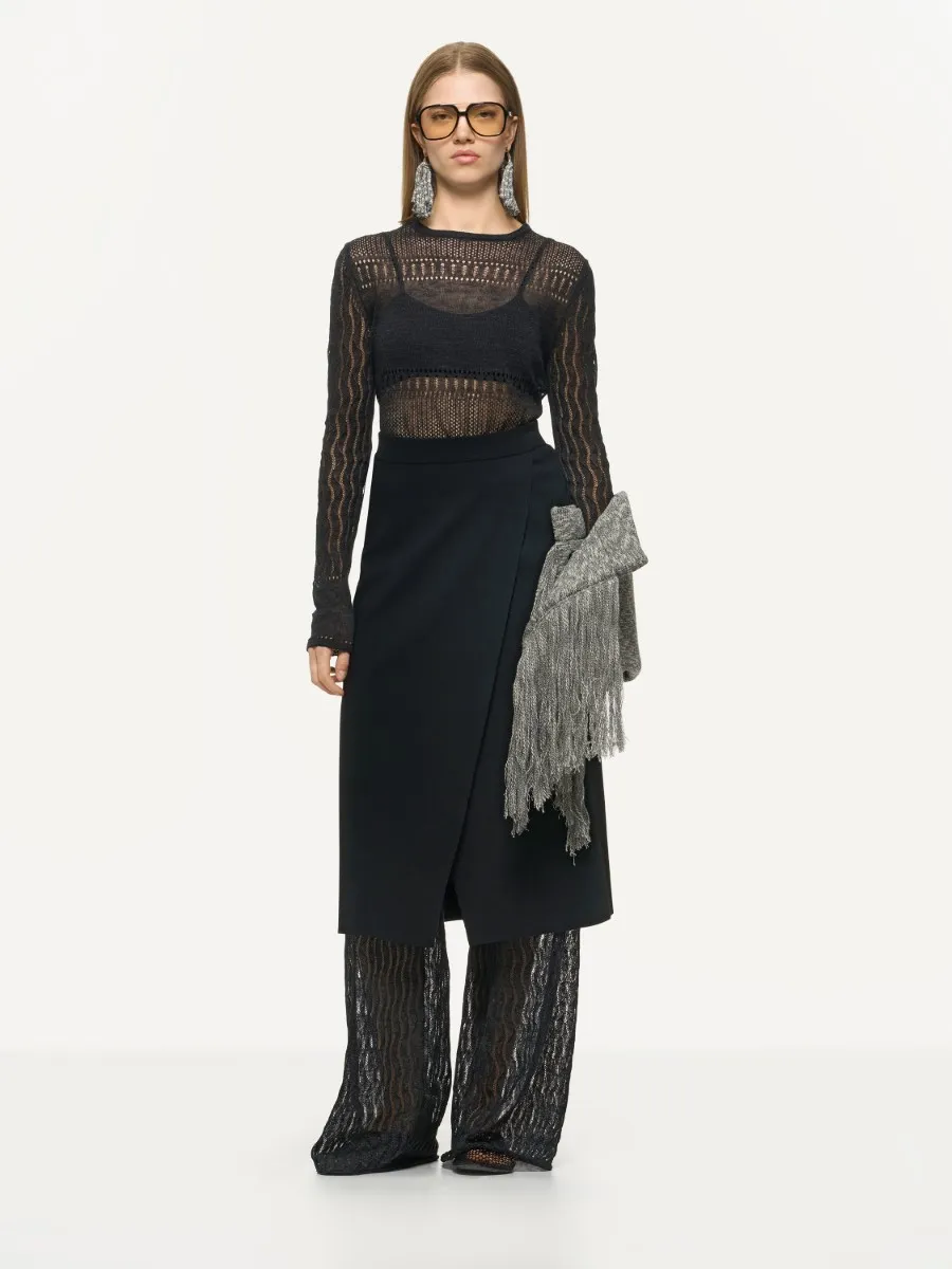 Knitwear is the soul of the collection: undisputed protagonist, it’s reinvented through elaborate pleats with nylon intarsia that create transparencies or buttonholes to add three-dimensionality effect and movement.
