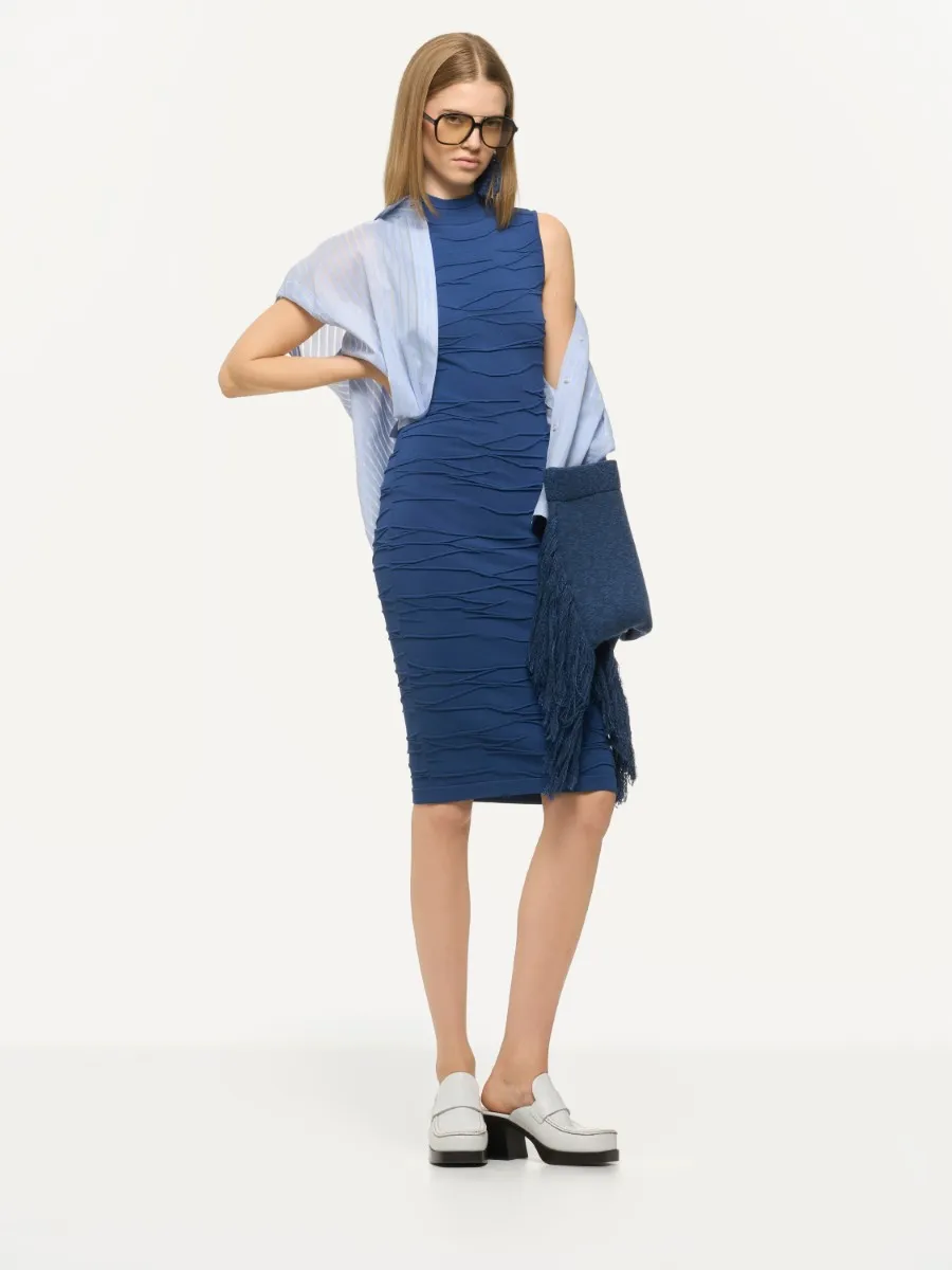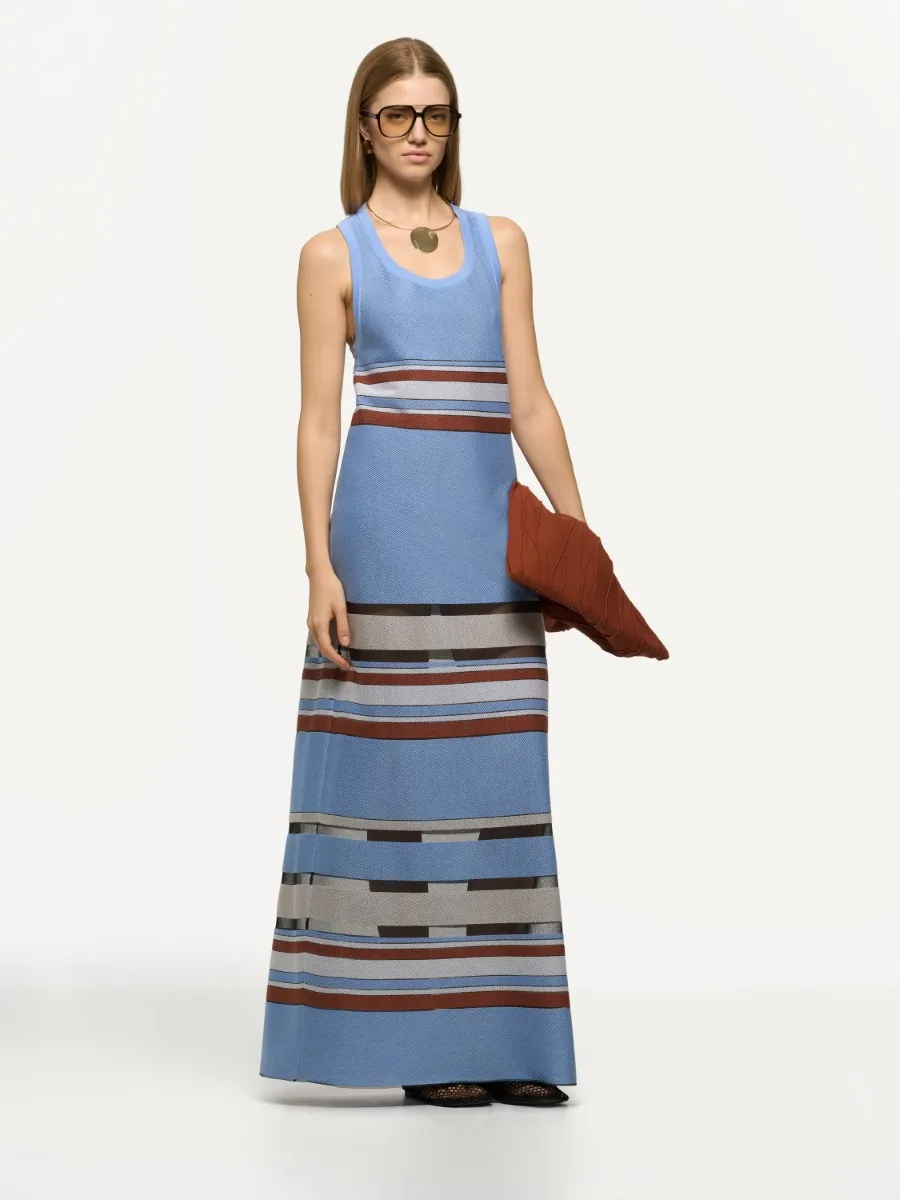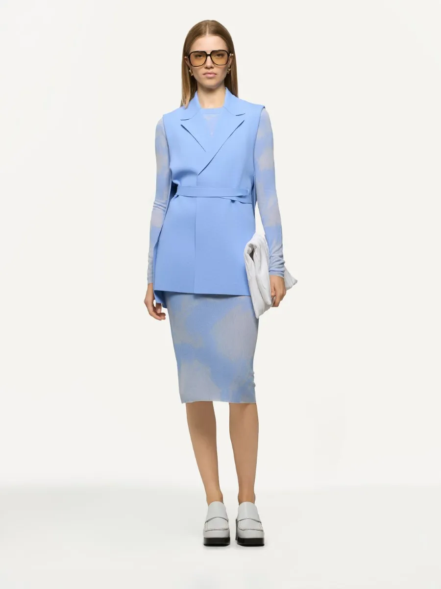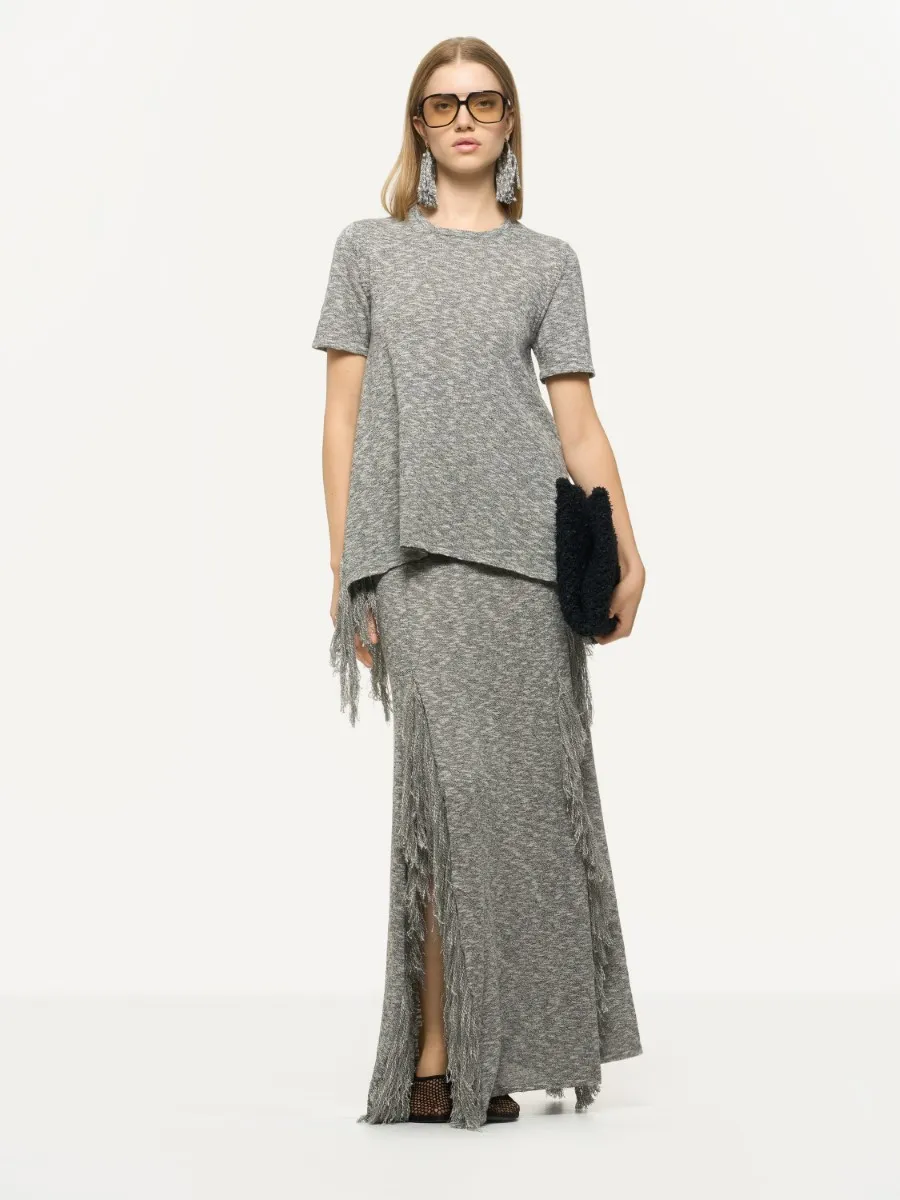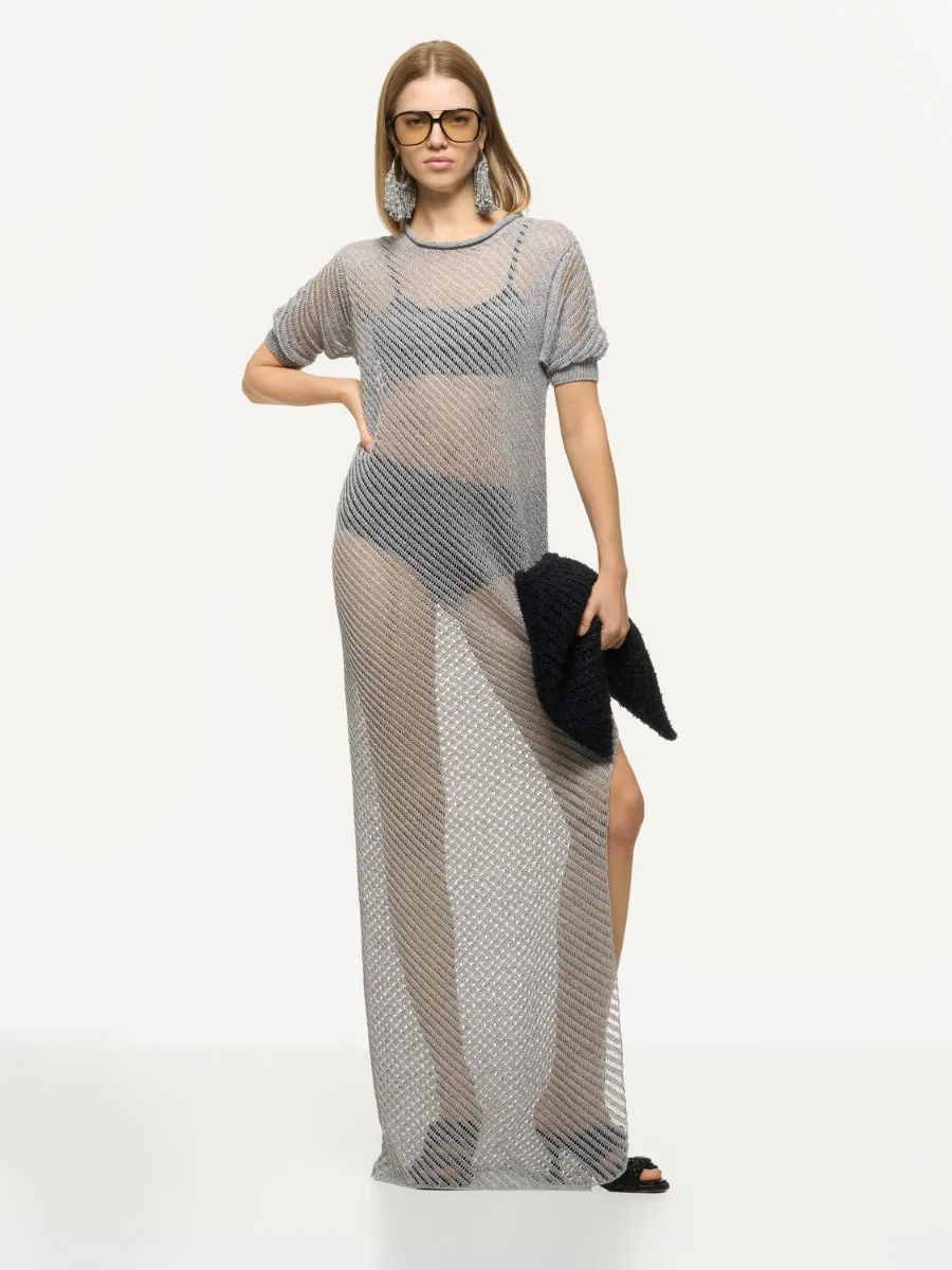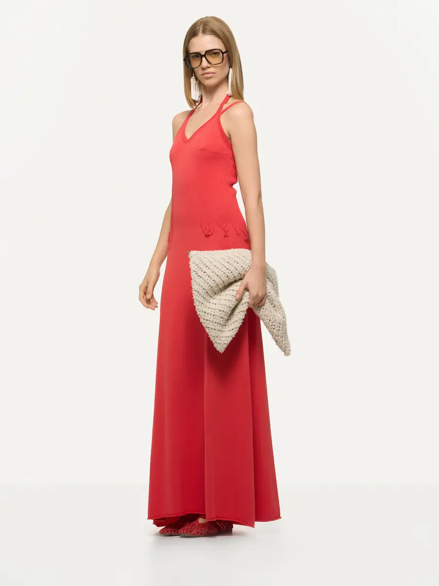 Knitwear is the soul of the collection: undisputed protagonist, it’s reinvented through elaborate pleats with nylon intarsia that create transparencies or buttonholes to add three-dimensionality effect and movement.
