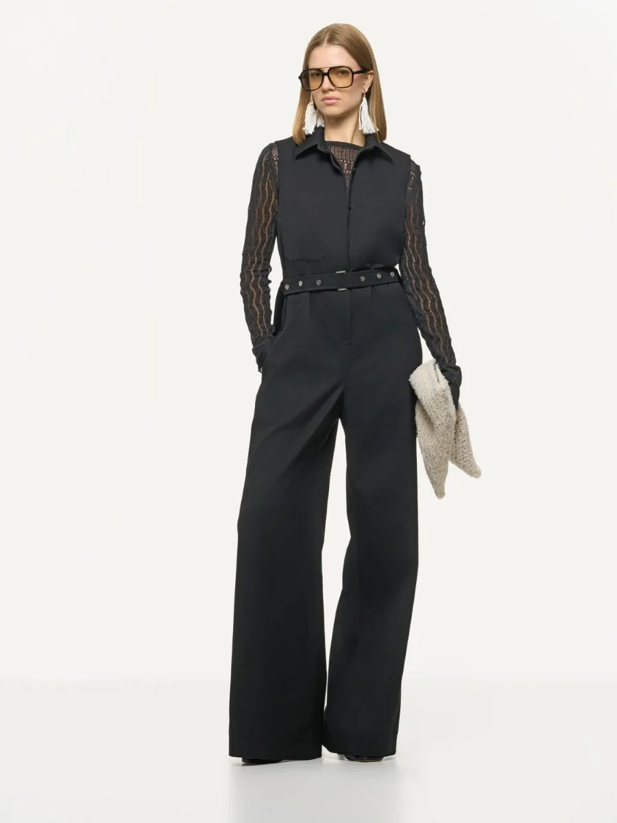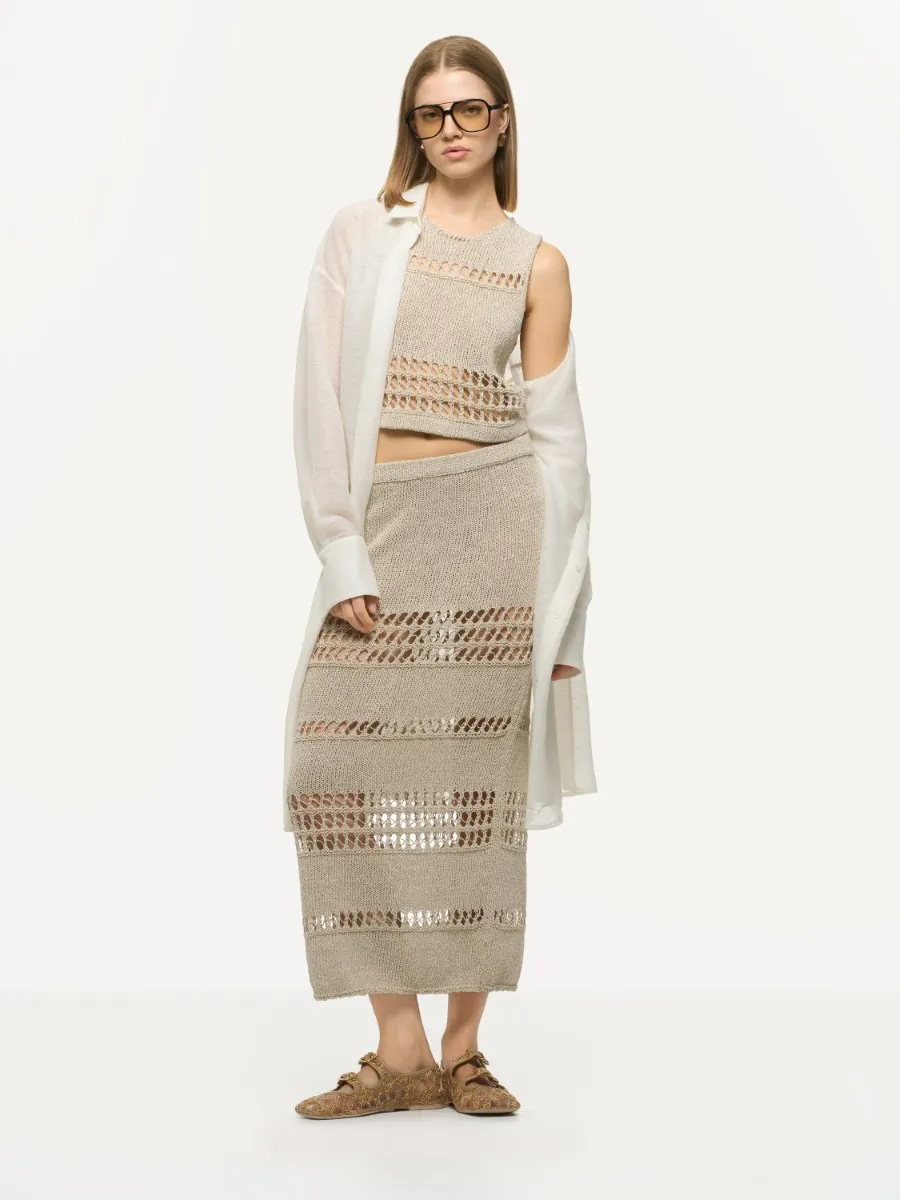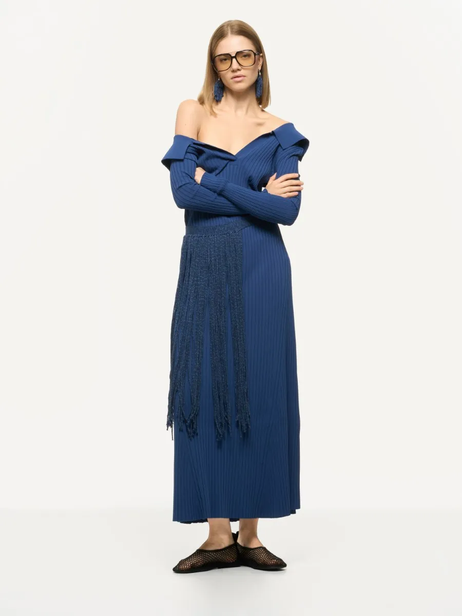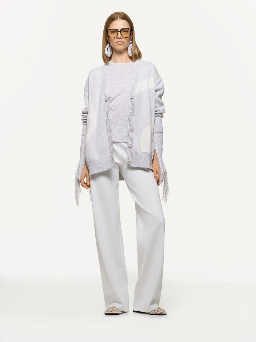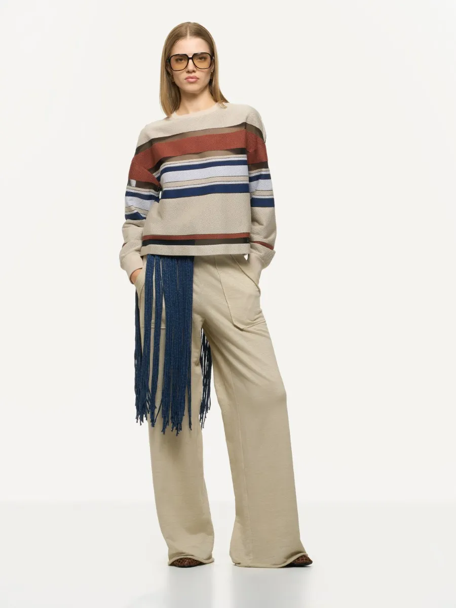 Knitwear is the soul of the collection: undisputed protagonist, it’s reinvented through elaborate pleats with nylon intarsia that create transparencies or buttonholes to add three-dimensionality effect and movement.