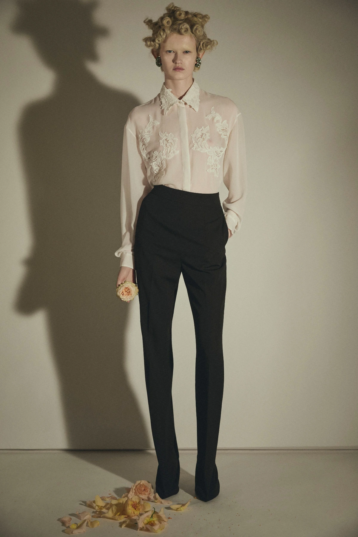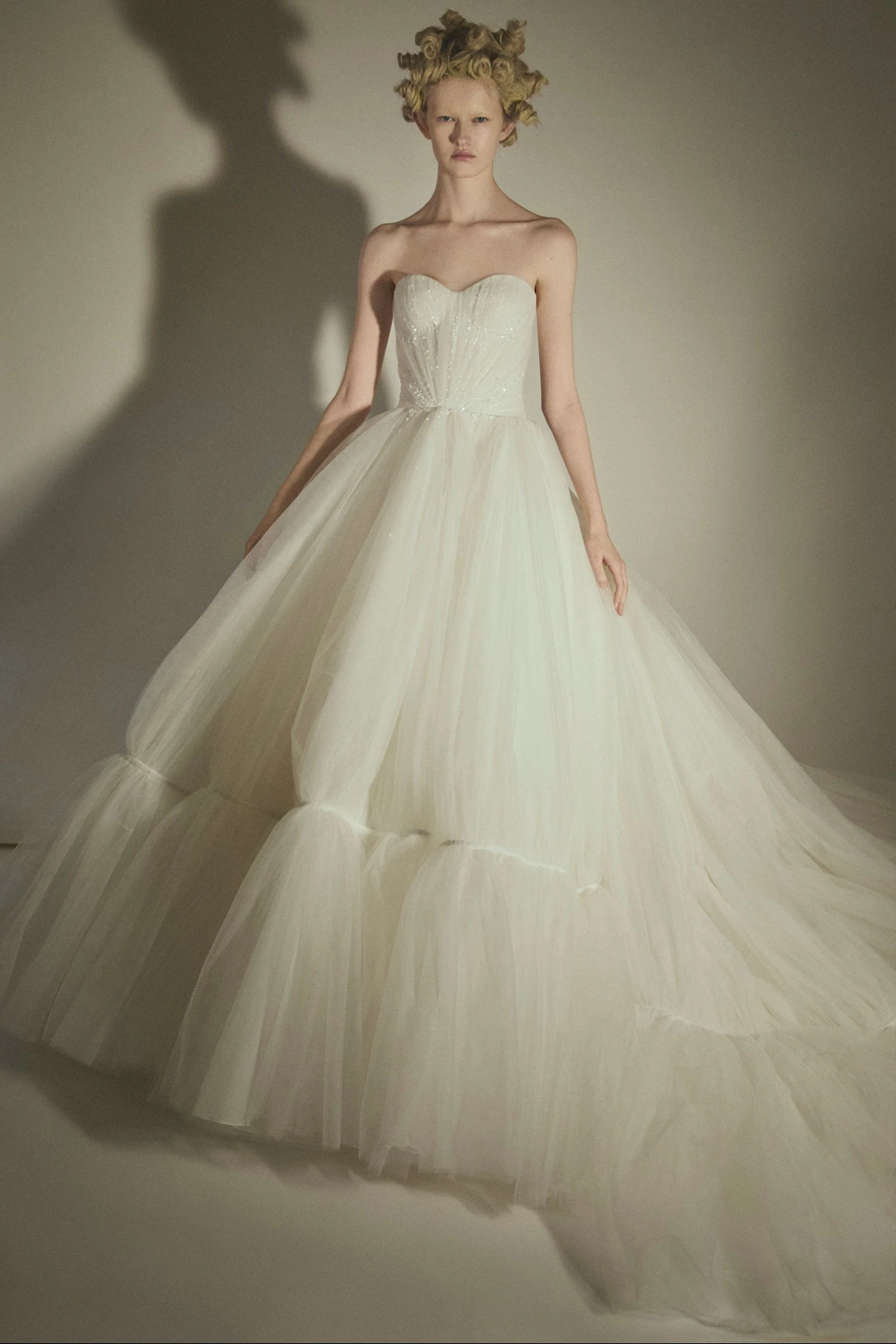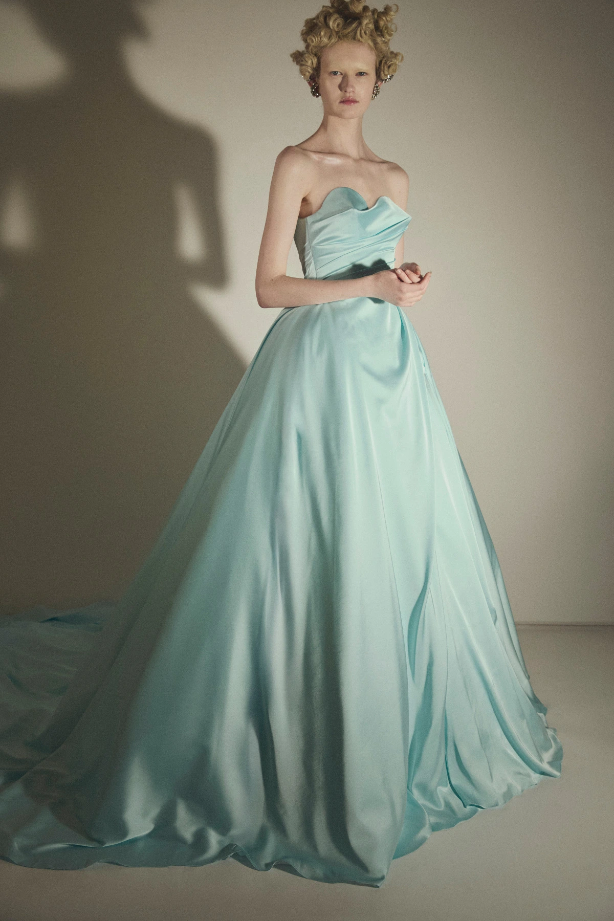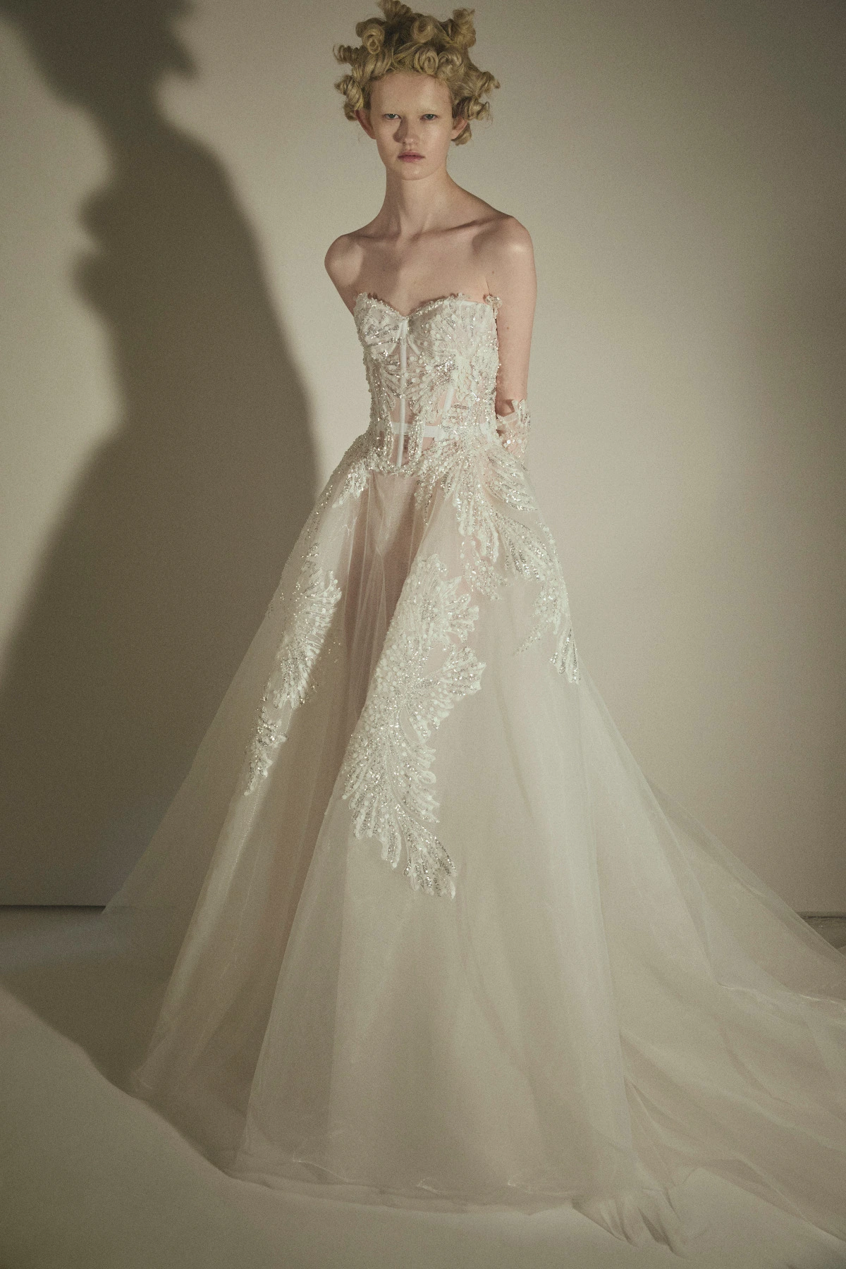 The narrative then opens onto a visionary garden of flowers crafted from crystal and three-dimensional sequins, resting on layers of tulle in the delicate hues of “fior di Maggio”. this is followed by crinoline gowns, embroidered with precious stones and crystals concealed beneath masterful tulle drapery, articulated by mirrored decorative elements in crystal and silver. these looks reinterpret the archetype of the aristocratic bride, a timeless emblem of haute couture and the maison’s identity.