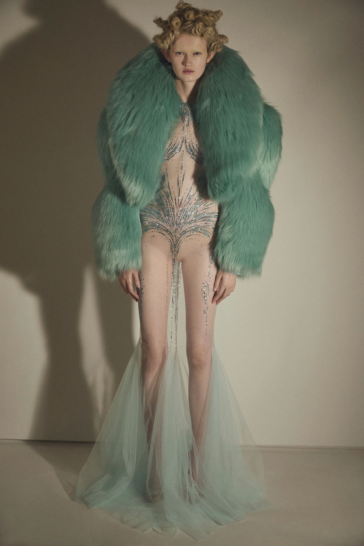 Shades of sky blue and aqua bohemica illuminate an ethereal tulle dress, embroidered with crystals that glide across the body with a liquid effect, sheltered beneath an oversized mint-green fur jacket. Color transforms into atmosphere, suspension, breath.
