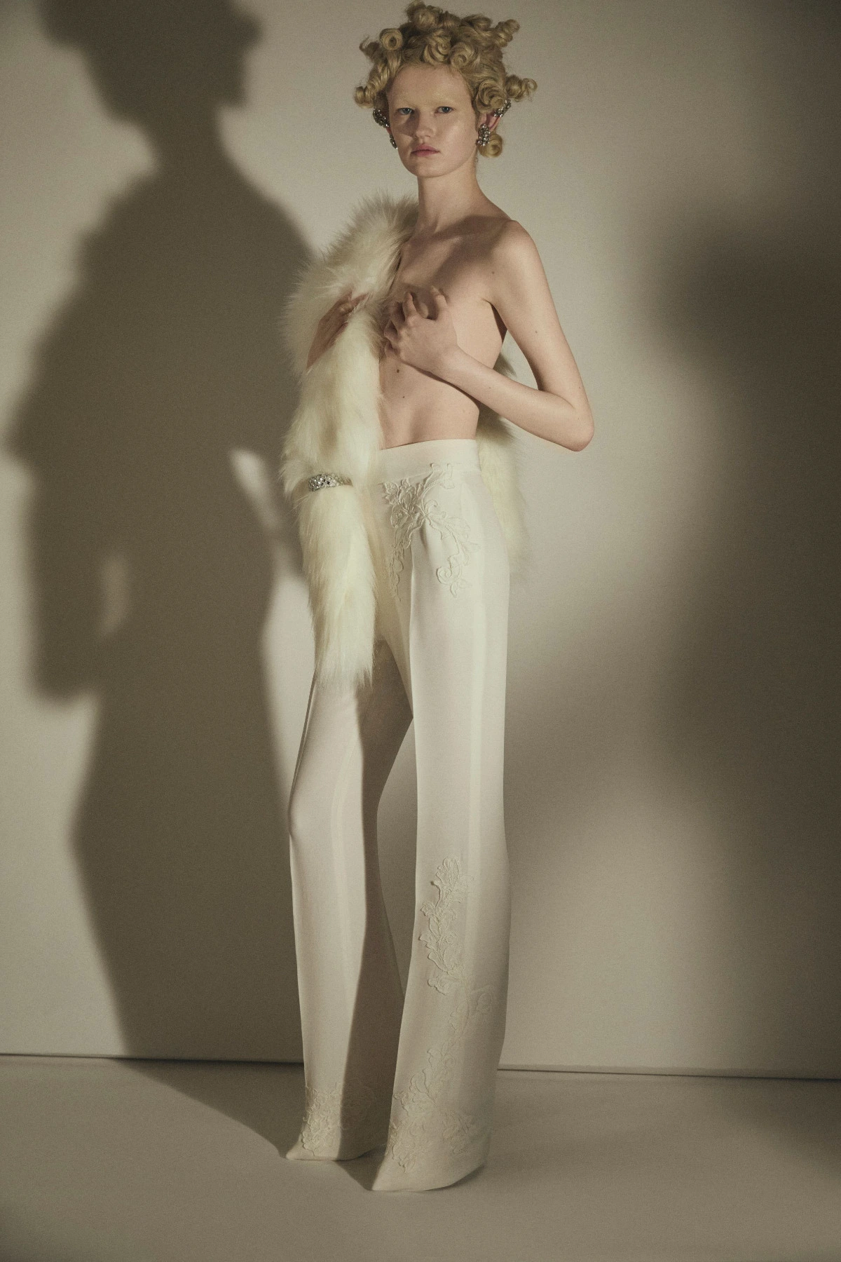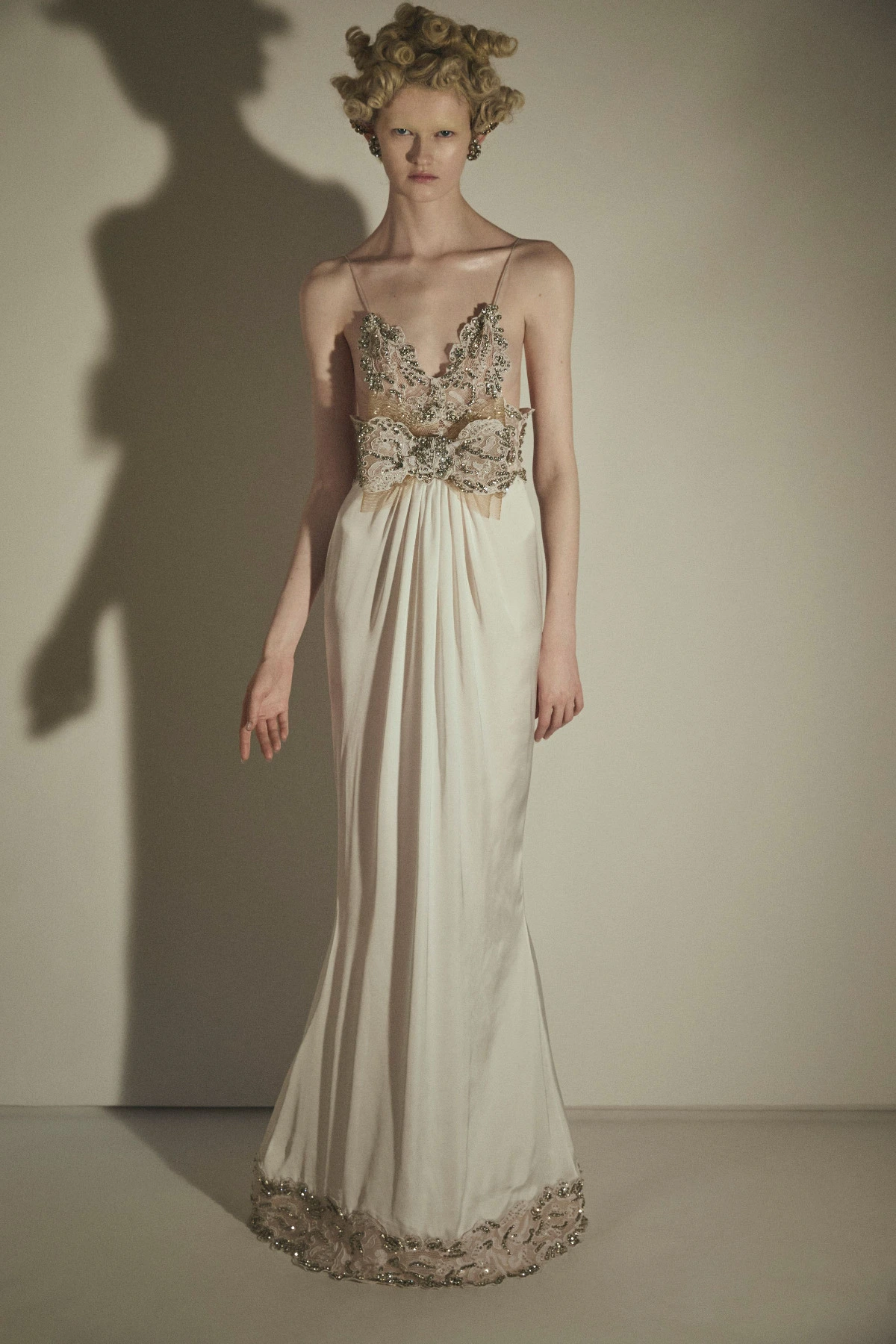 “Bouillonné” surfaces give rise to a living matter, from which the image of a silvered christ emerges as the symbolic core of the collection. this iconography returns through embroidery and encrustation, framed within a baroque structure that shapes a long tunic in pure white chiffon, where purity and formal rigor converge.