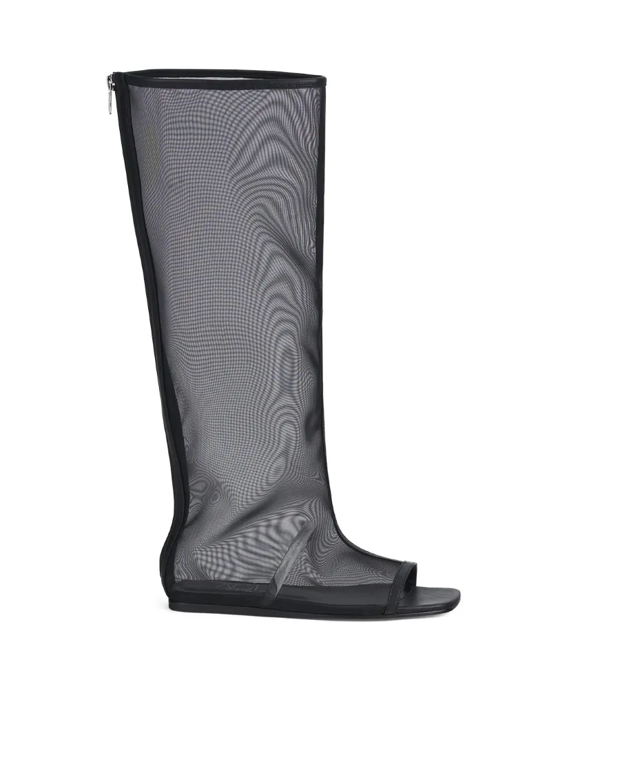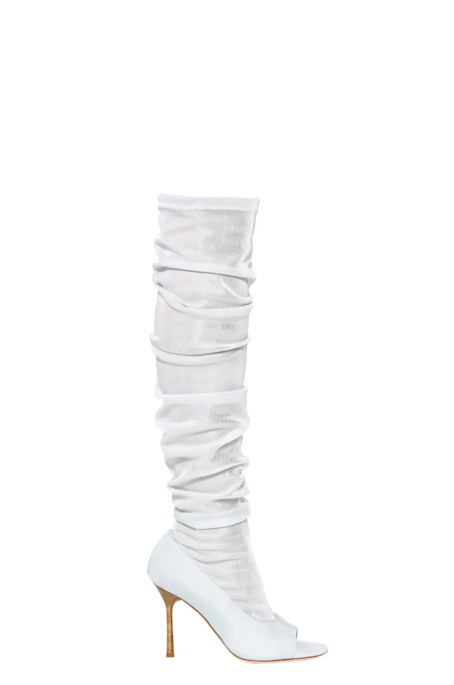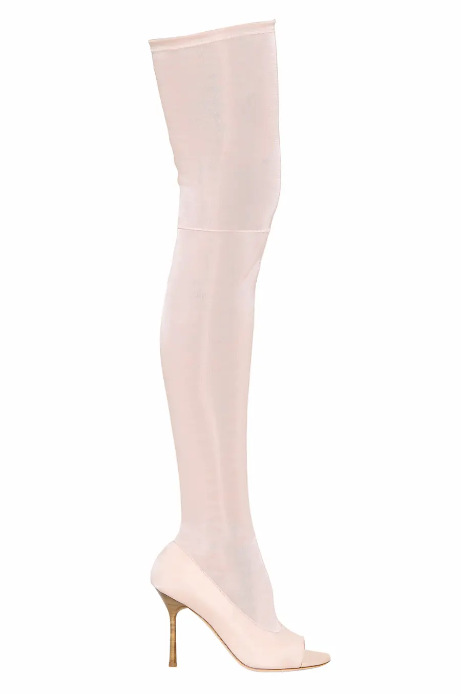 Technical Tulle, Sheer Transparencies: The most daring styles are those crafted in transparency: the see-through white sneaker, the black ultra-flat open-toe sandal boot with a graphic structure, and the over-the-knee second-skin-effect style set on a 9 cm tapered heel, presented in the new essential shades of powder and dusty nude.