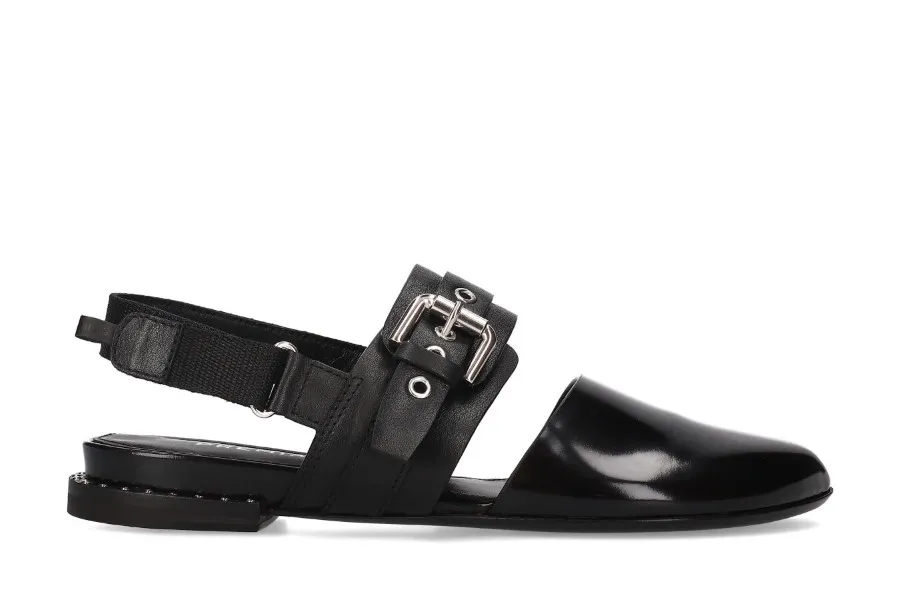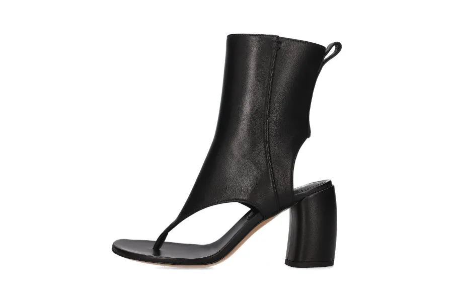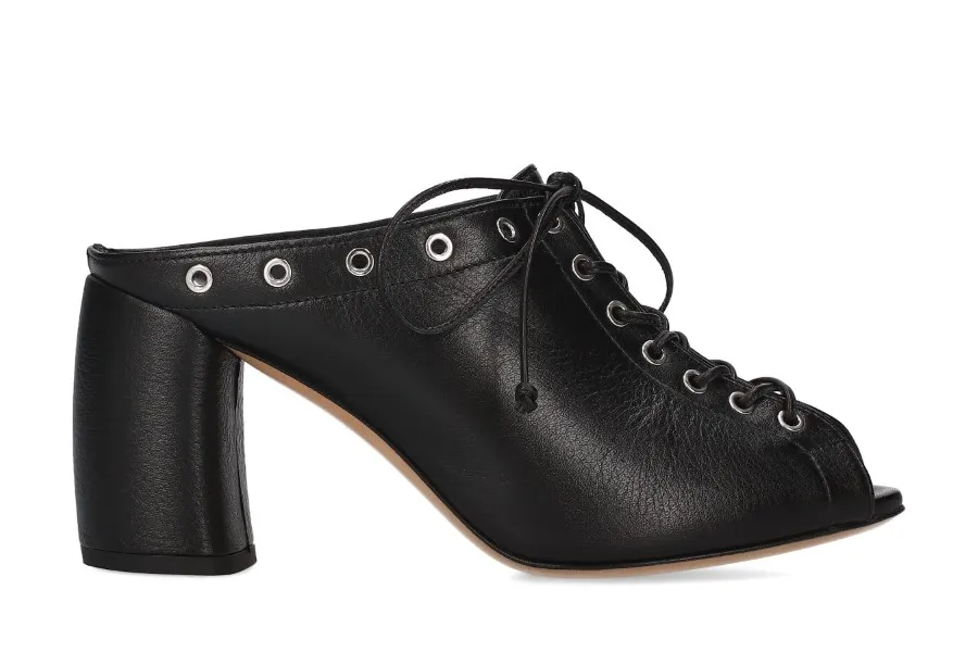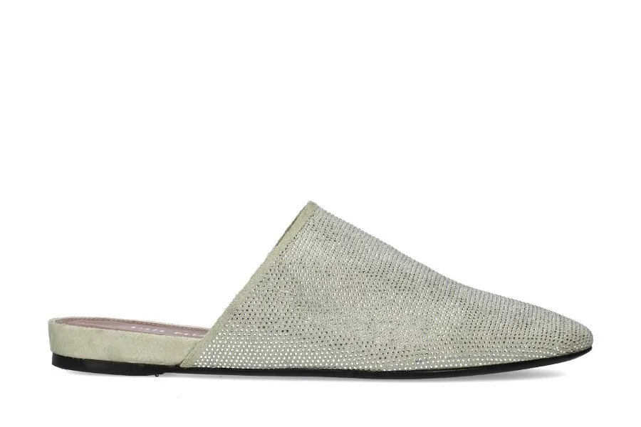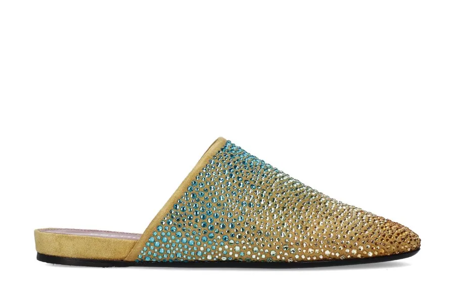Throughout the collection, material and chromatic experimentation plays a central role: neutral tones – black, ecru, tobacco – dialogue with intense accents of raspberry, olive green, sage and gold; the surfaces alternate glossy paints, so suede and laminated leathers, while rhinestones, metal inserts and painted details add brightness, reinforcing the refined and distinctive vocation of the proposal.